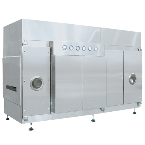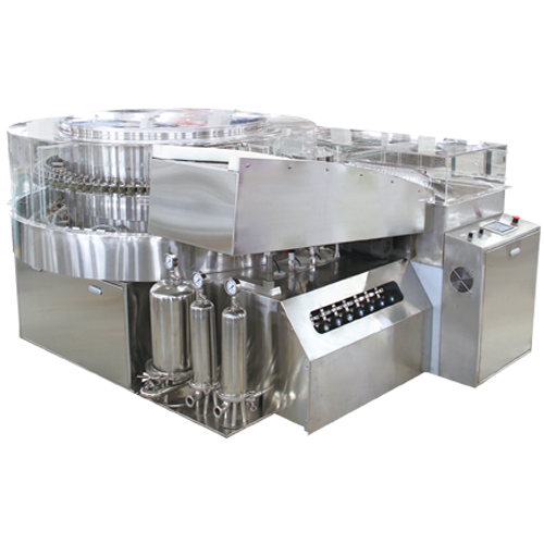 根據不同瓶子的形狀,調換轉鼓結構(gòu),采用撥輪送瓶,轉(zhuǎn)鼓間歇進瓶,利(lì)用超聲波粗洗,純化水或注射用水交替衝(chōng)洗,最後經潔淨壓縮空氣吹幹完成洗瓶,本機可單機也可(kě)聯線生產