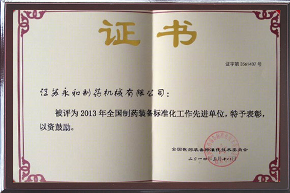 • 全國製(zhì)藥裝備標(biāo)準化工作先進單位證書