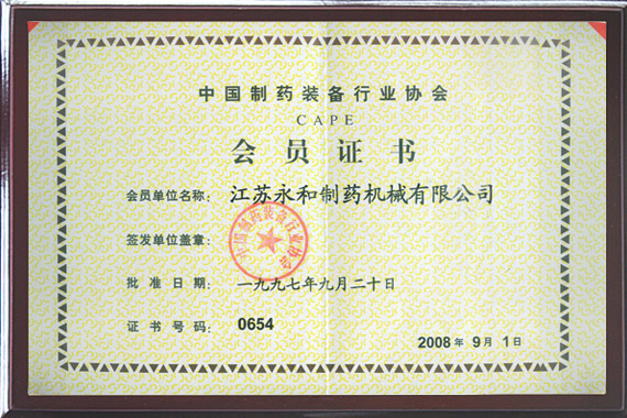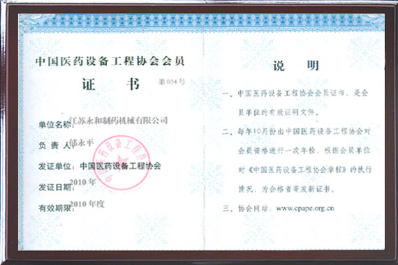 • 中國(guó)製藥裝備行業協會(huì)會員證(zhèng)書