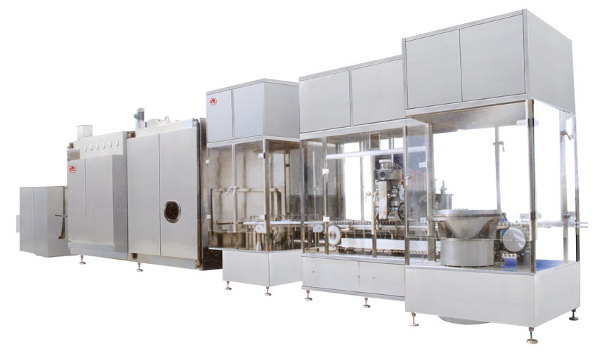本機組符合“cGMP”要求,適用於西林瓶的洗瓶、烘幹滅菌及粉劑分裝,由LXP型鏈式多功位清洗機(jī)、KSM型玻璃瓶隧道(dào)式滅(miè)菌幹燥機及QFZ型氣流式粉劑分裝機組成。