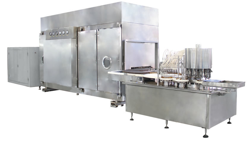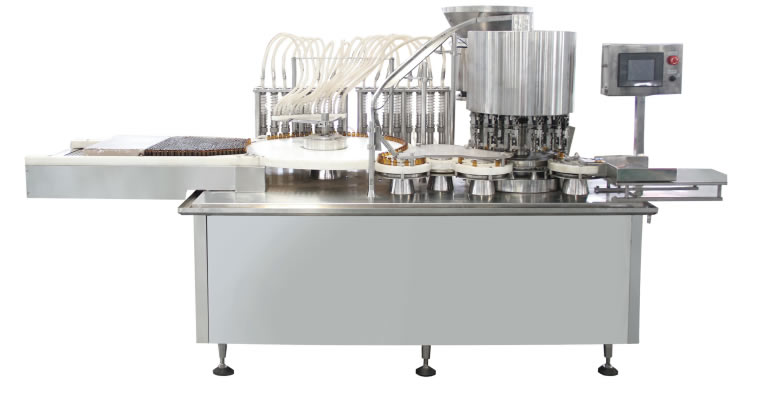該線采用觸摸屏動態顯示操作,PLC程序(xù)控製;主機變頻調速。瓶(píng)子先經超聲波粗(cū)洗,後由特製瓶鬥傳輸,經過九組工位內外壓力衝洗後,進入(rù)高溫隧道烘箱內滅菌、然後轉入灌封機,由漸進式攔邊網帶進瓶、陶瓷泵(bèng)跟蹤灌裝(zhuāng)、柔性單(dān)刀或三刀滾壓跟蹤軋蓋、凸輪式收瓶裝置等先進工序,自動化程度高(gāo)。是口服液高產量(liàng)新型的理想設備。