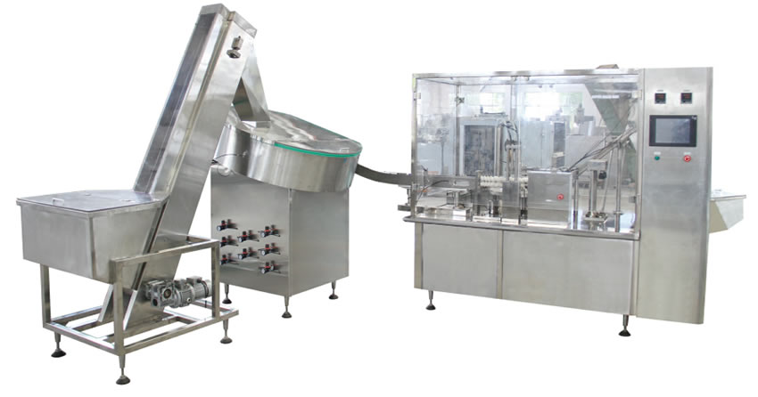 本機組符合“cGMP”要求,適用於新型(xíng)易折塑料瓶的(de)灌裝與熱封口,是參照國外(wài)同類機型更新設計而(ér)成。 本機通過自動上瓶、底部灌(guàn)裝、自動上(shàng)蓋、熱熔式底部封口、機械手送出瓶等一係列特製(zhì)工序(xù)後完成灌封 工作,是國內口(kǒu)服液灌裝生產的理想設備。
